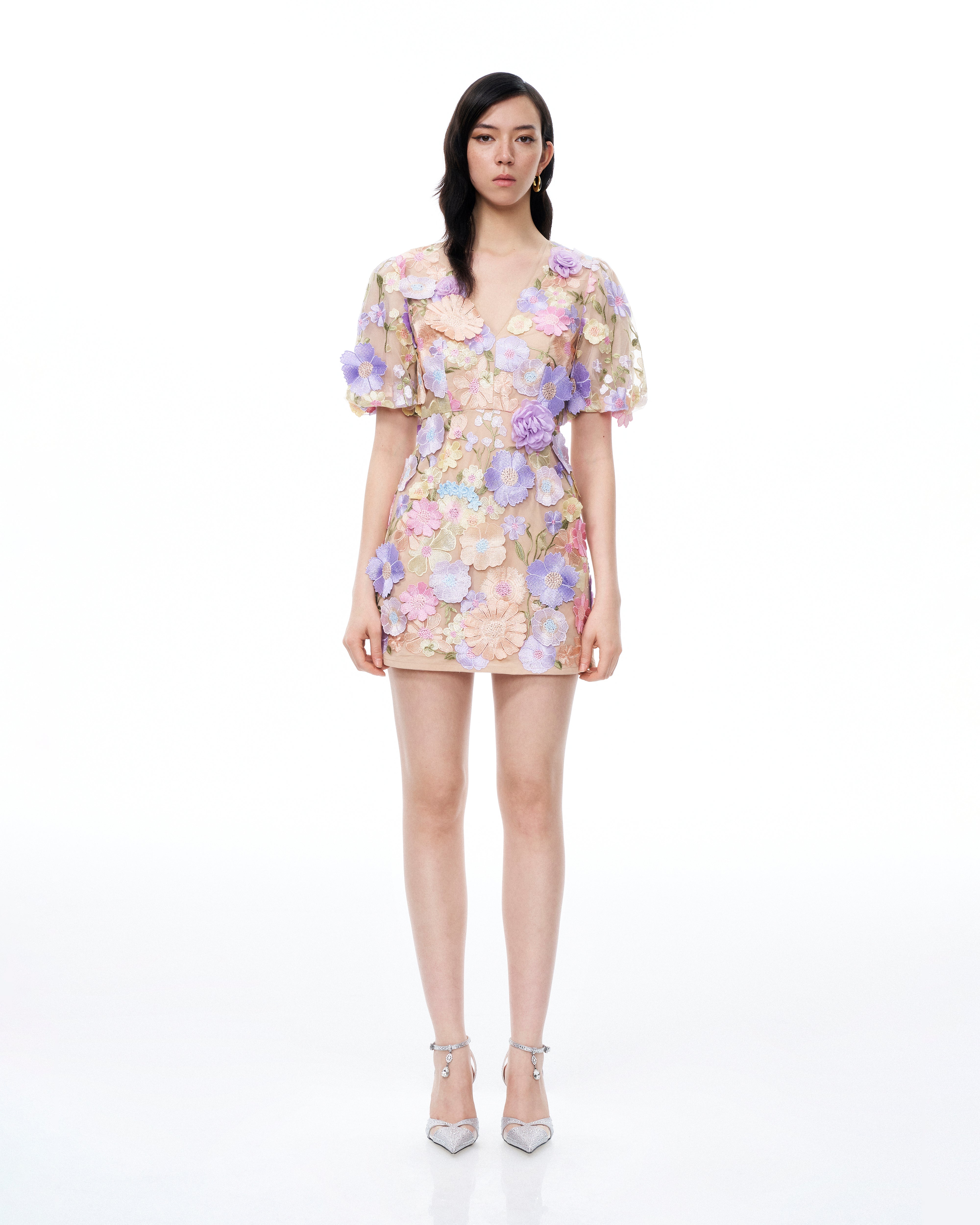 Evangeline 3D V-Neck Floral Embroidered Dress - Pastel Multi